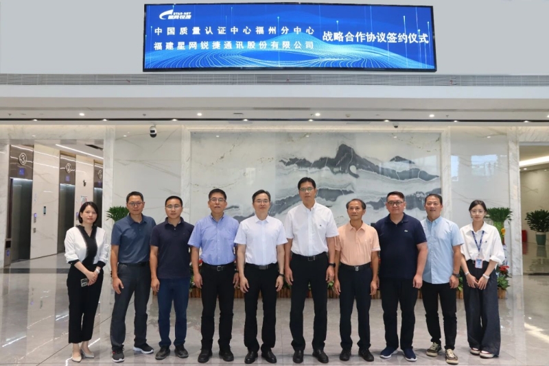 8月29日,福建星网锐捷通讯股份有限公司(以下简称“星网锐捷”)与中国质量认证中心福州分中心(以下简称“CQC福州分中心”)达成战略合作。星网锐捷党委书记黄昌洪、副总经理赖国有,CQC福州分中心主任郑秀文、副主任陈兴等领导共同出席签约仪式,并参观了星网锐捷智慧展厅及实验室。