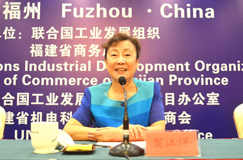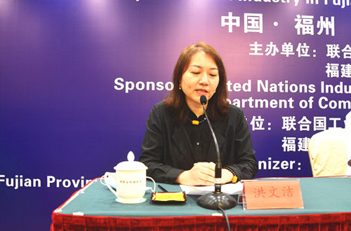 (联合国工业发展组织福建项目办公室总协调员贺汪洋致词)