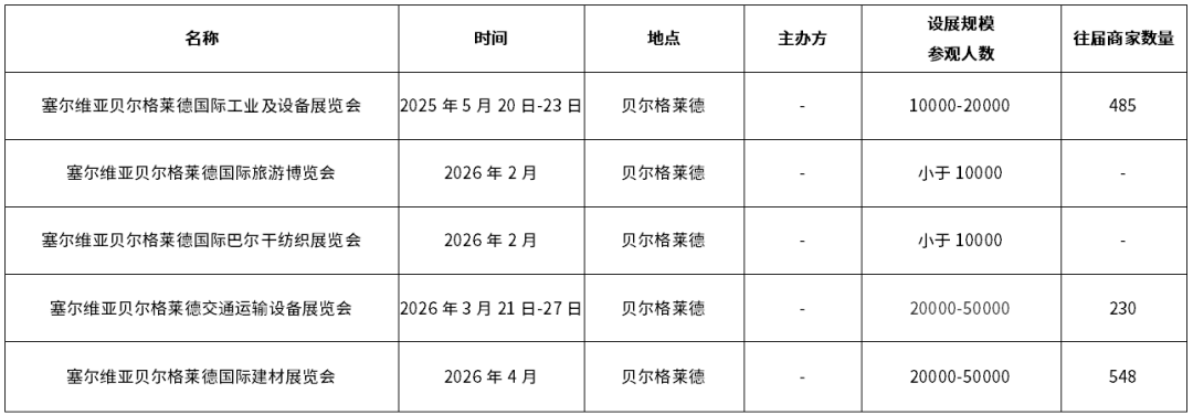 2025年至2026年,塞尔维亚计划组织14场展会,主要举办地在贝尔格莱德,涉及行业包括电子/电力/通讯/网络(4个)、运输/物流/仓储(2个)、农/林/牧/渔(2个)、汽配/摩配/自行车(2个)、建材/石材/照明/暖通(1个)等。2025年第二季度,值得关注的展会有塞尔维亚贝尔格莱德国际工业及设备展览会,将于2025年5月20日至23日在贝尔格莱德市举办。