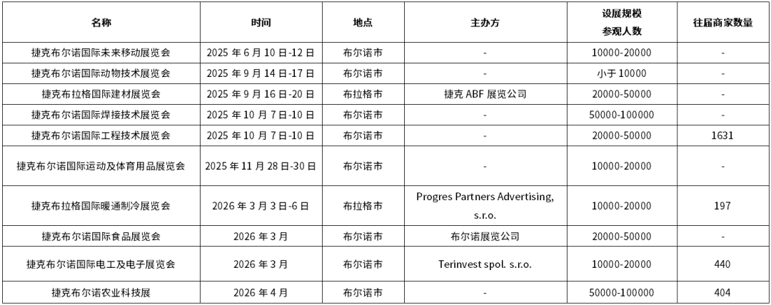 2025至2026年,捷克计划组织约55场展会,主要举办地在布拉格和布尔诺,涉及行业包括建材/石材/照明/暖通(13场)、机械/五金/工业(5场)、汽配/摩配/自行车(4场)、体育/户外/影视(4场)。近期值得关注的展会有捷克布鲁诺国际工程技术展览会(MSV),将于2025年10月7日至10日在布拉格市举办。2026年,值得关注的展会有捷克布尔诺农业科技展(IFAT),将于2026年4月在布尔诺市举办。