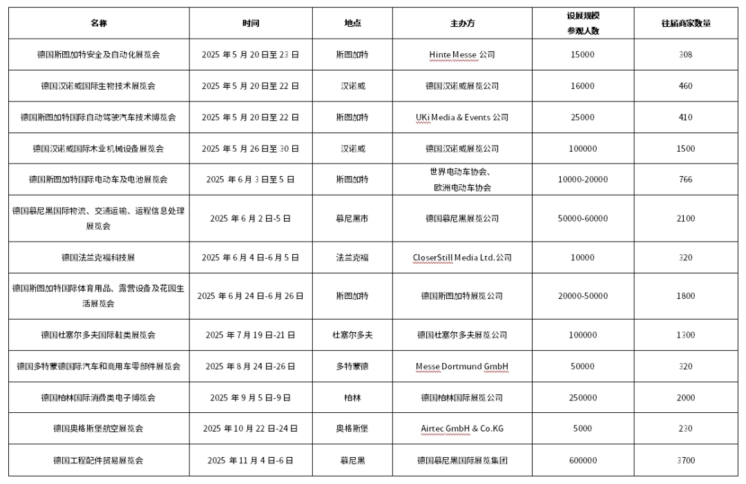 2025至2026年,德国计划组织约558场展会,主要举办地在柏林、慕尼黑、斯图加特、杜塞尔多夫和科隆等大中城市,涉及行业主要包括:机械/五金/工业(63场)、建材/石材/照明/暖通(47场)、汽配/摩配/自行车(41场)、办公/礼品/消费品/玩具 (41场)、食品/果蔬/饮料/酒(35场)、印刷/包装/纸业(17场)、化工/环保/能源(13场)、生物/医疗/保健(2场)以及计算机/软件/网络(1场)。2025年第二季度,值得关注的展会有德国斯图加特国际电动车科技及电池展览会(THE BATTERY SHOW EUROPE),将于2025年6月3日至5日在斯图加特举办。