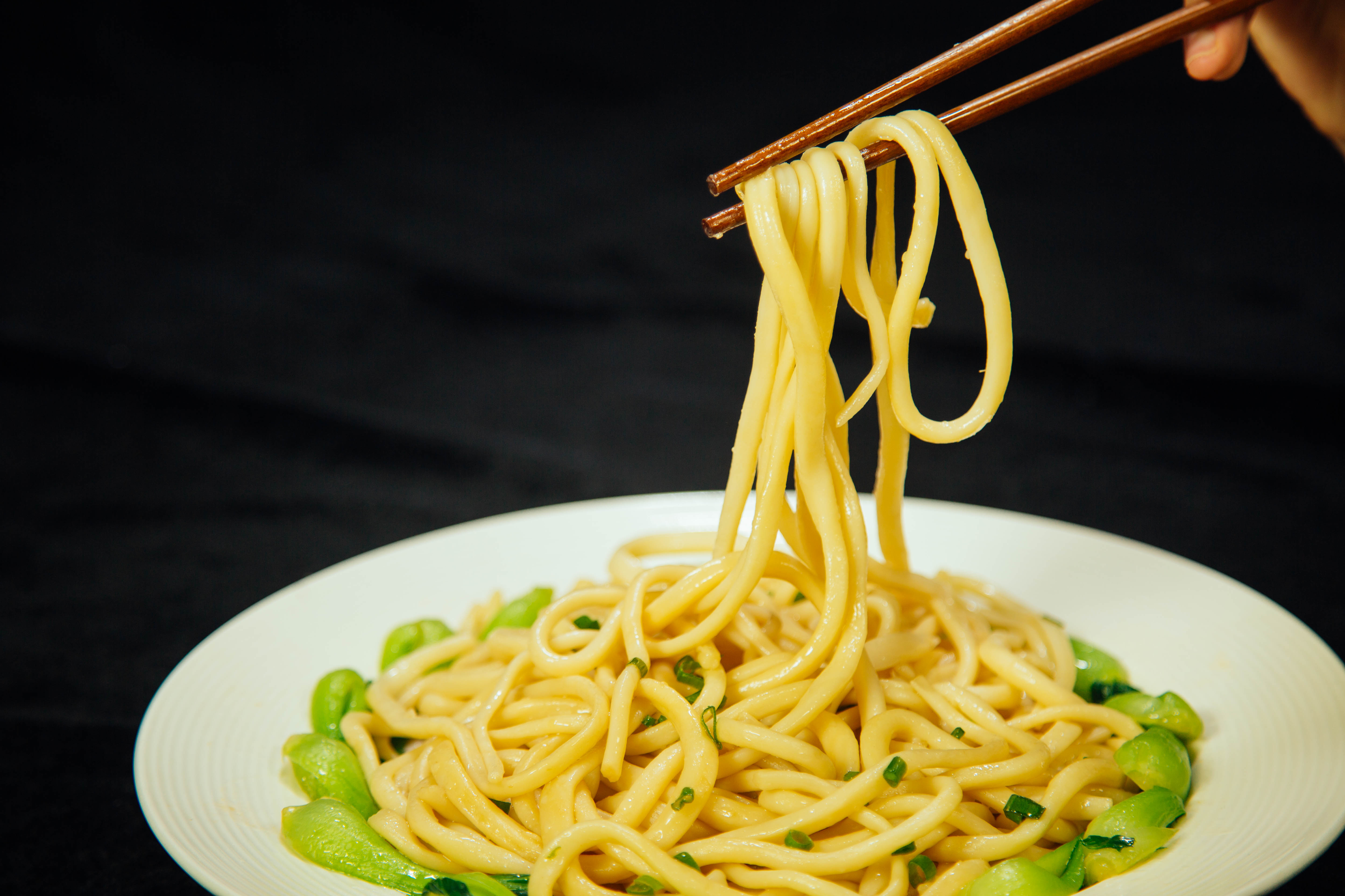 【制作方法】1.高筋和中筋面粉各半,将一定比例的食用碱和食盐溶在水里,边搅边淋碱盐水,直到和成面团。发酵到一定时间,将面团放在专用面床搓揉,感到有一定韧性和弹力时,用手工拉至筷子粗细,放入沸水焯熟。待面浮出水面,捞出放入冷水冷却后捞出沥去水份,常温凉至2小时以上待用。