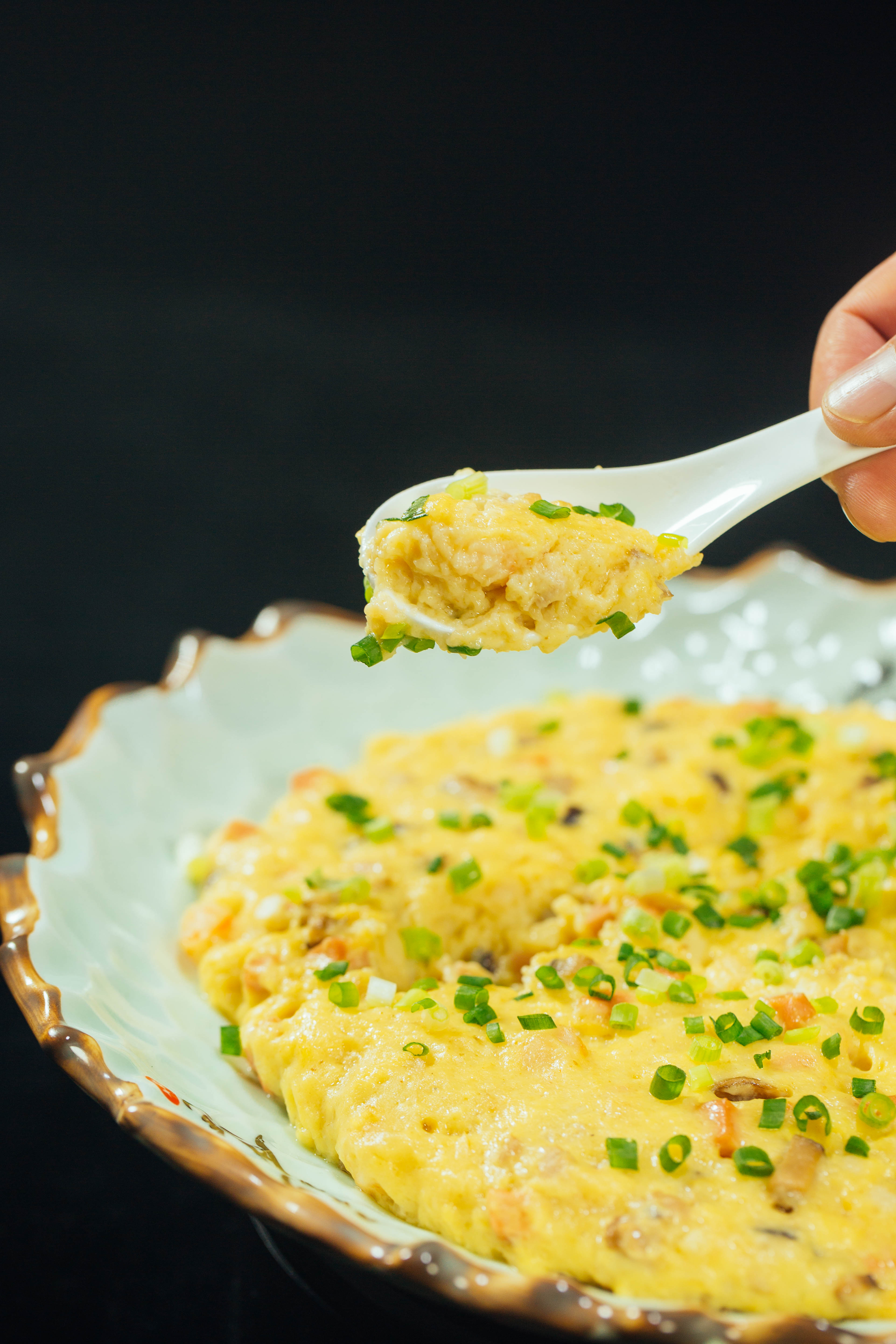 【菜肴食材】 鸡蛋5个、水发冬菇25克、水发干贝25克、火腿25克、鲜虾仁25克、瘦肉25克、熟净冬笋25克、葱2根、精盐3克、料酒3克、胡椒粉2克、花生油75克、地瓜粉180克、高汤600克。