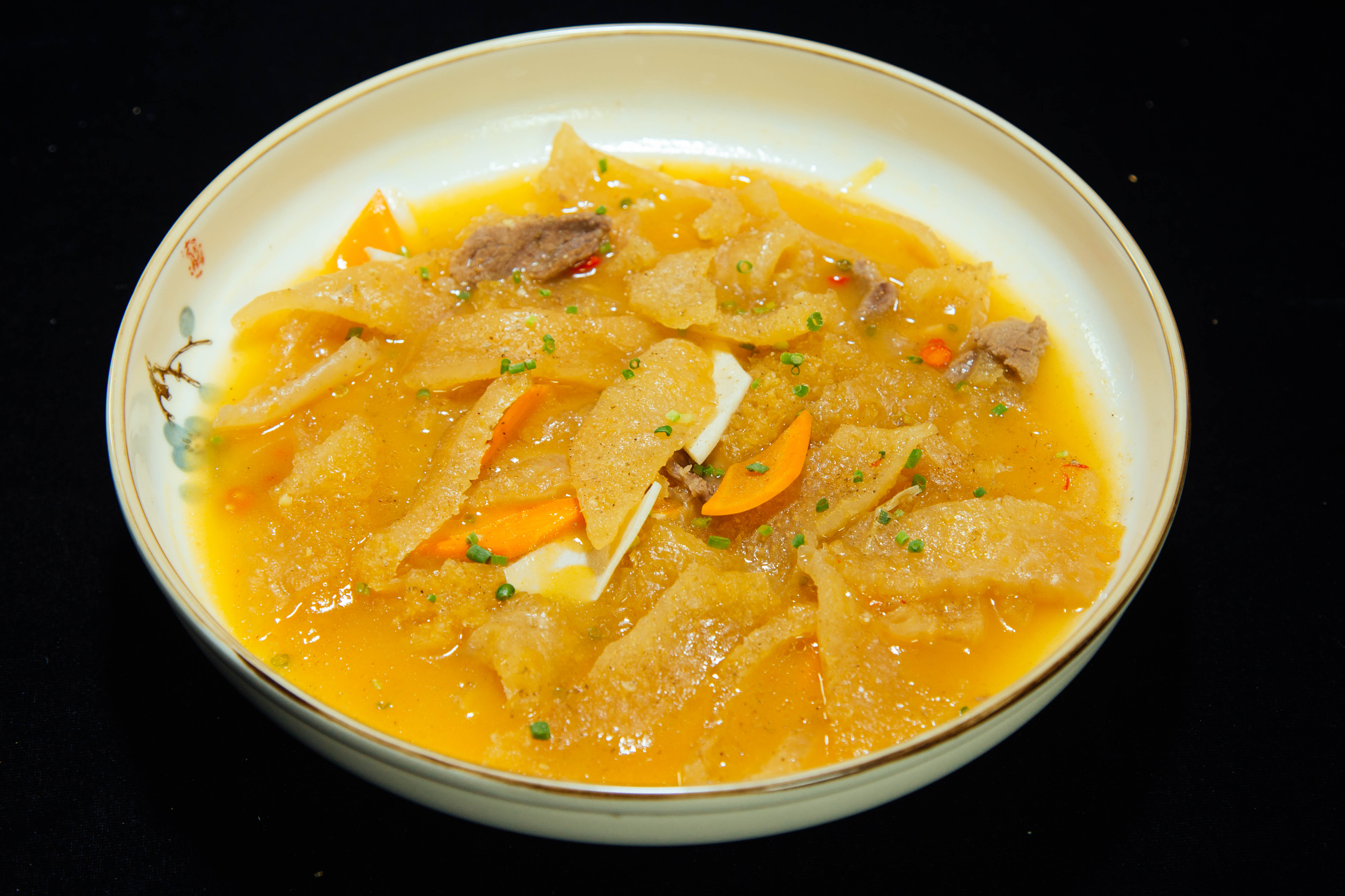 【菜肴食材】沙发干肉皮150克、瘦肉50克、净冬笋50克、高汤600克、生姜5克、葱3克、小山椒5克、地瓜粉8克、料酒3克、味精3克、白砂糖8克、胡椒粉3克、食盐5克、酱油5克、米醋15克、熟猪油9克、食用碱5克。