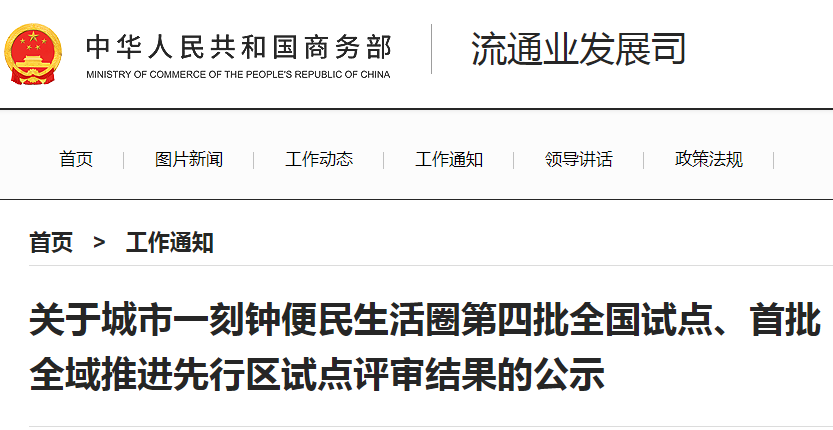 关于城市一刻钟便民生活圈第四批全国试点、首批全域推进先行区试点评审结果的公示