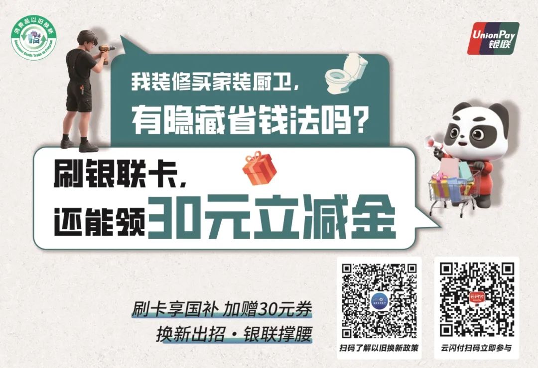 福建银联充分发挥平台优势,通过联合银行和商户资源,推出多重优惠组合:使用银联卡线下刷卡消费,参与完以旧换新活动后还可以领取30元云闪付立减金;用云闪付使用信用卡支付参与以旧换新也可以领取送5元还款券;福建银联推动工行、农行、中行、交行、邮储等10余家银行在政府补贴基础上,推出使用银联卡支付的叠加满减优惠。选择银联支付不仅可以享受国补,而且让焕新更轻松。