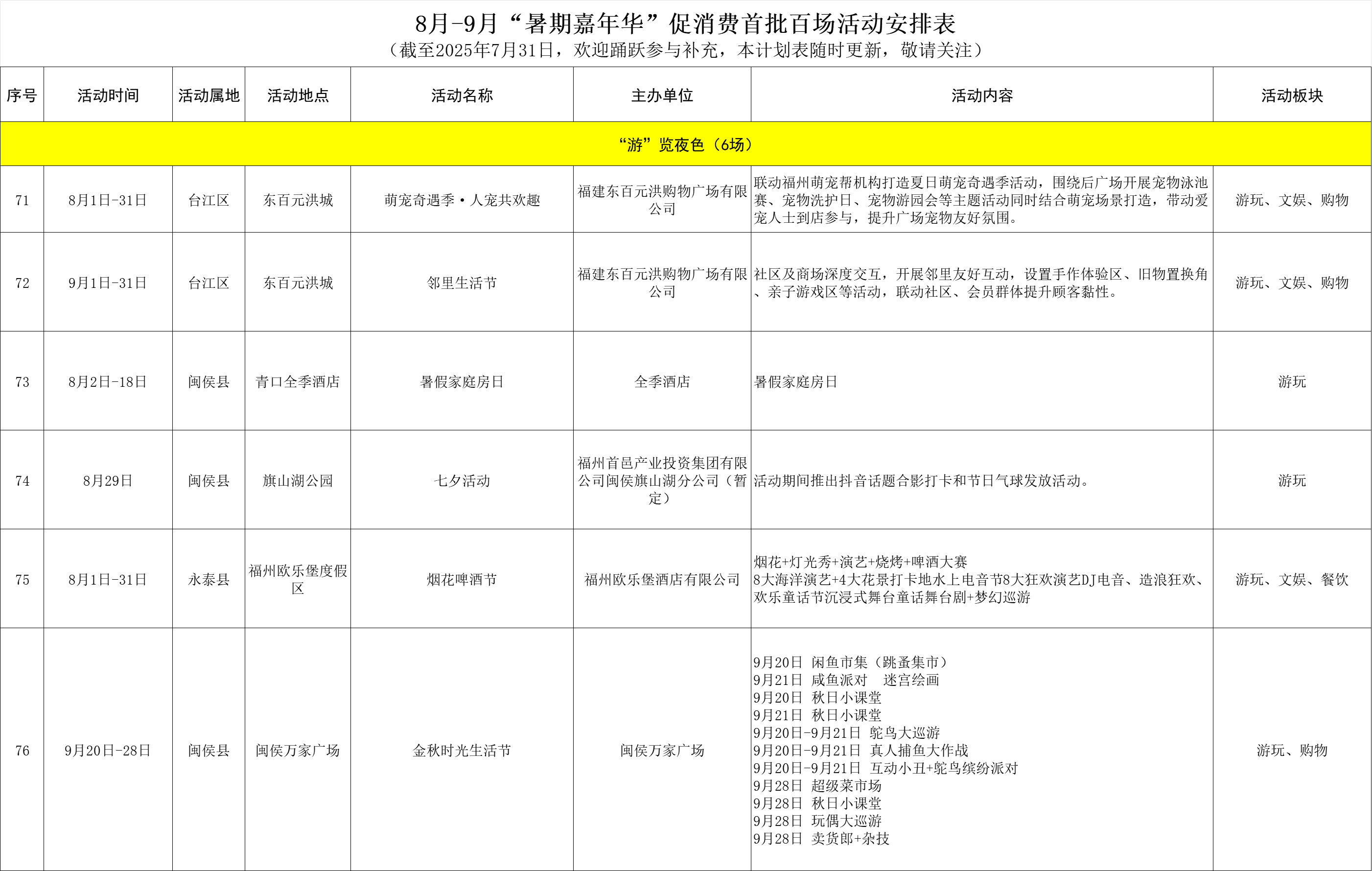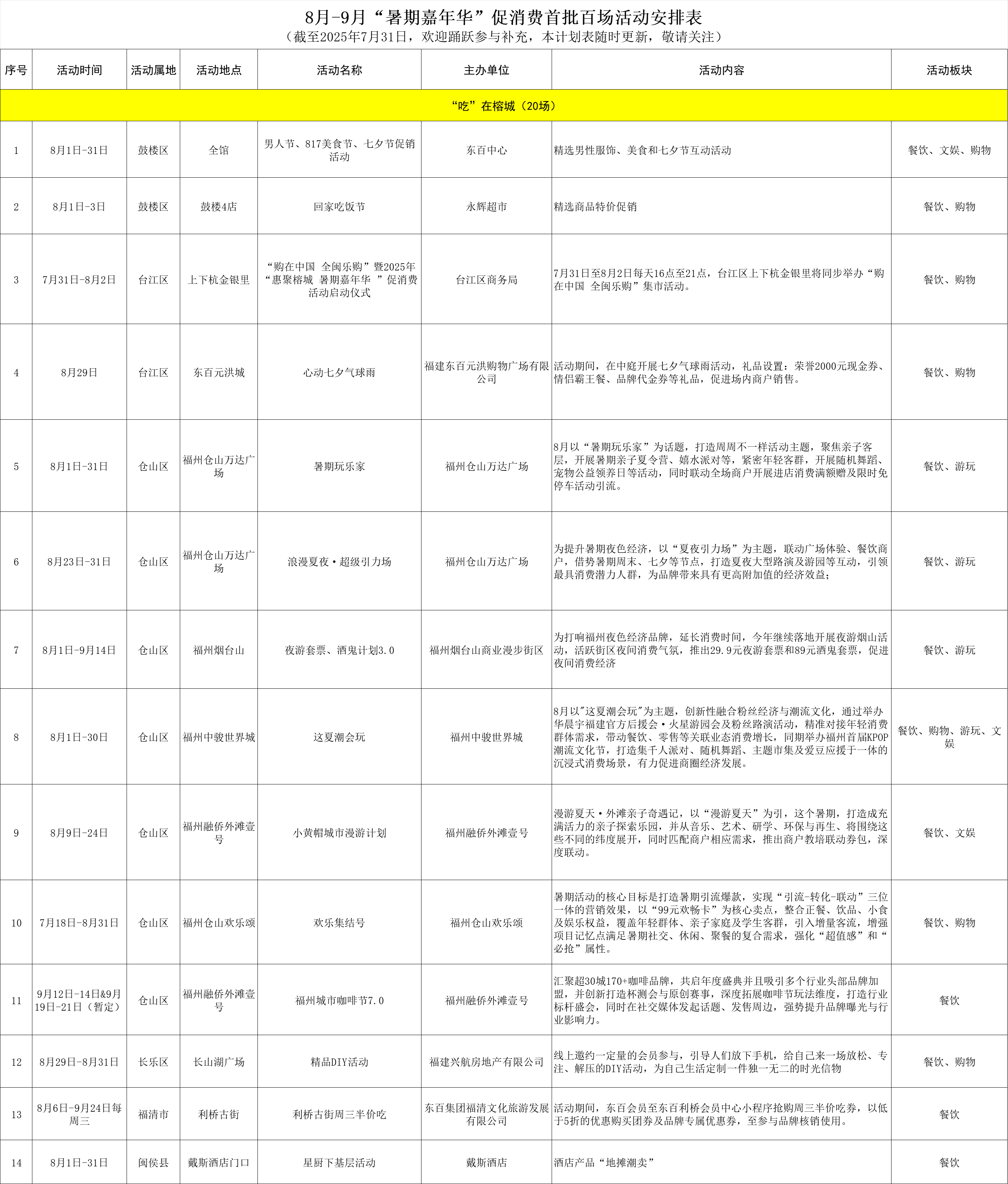各板块将深度结合福州本地特色与资源优势,推出一系列丰富多彩的活动内容。从知名餐饮企业、老字号品牌和特色小吃店的强强联合,到各大商圈、购物中心纷纷打折让利、满额赠礼、品牌日及会员日等促销活动轮番登场;再到灯光秀、音乐喷泉、街头艺术表演、文创市集、非遗体验等特色夜间文旅项目的一一呈现,还有一系列潮玩演艺活动为市民游客提供丰富的娱乐选择,以及各县市区的体育馆、运动公园举办的各类体育赛事和健身活动,都为市民游客打造全域联动、亮点纷呈的暑期消费狂欢。
