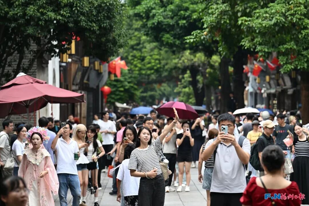 福州以“福文化”为核心,在三坊七巷、烟台山、上下杭、中洲岛等地推出沉浸式快闪、光影秀、无人机表演等活动,吸引大量游客。同程平台数据显示,国庆期间福州整体旅游订单量同比增长35%,酒店订单金额同比增长241%,入选同程旅行10月目的地榜单第二位。新华社16次报道福州文旅亮点,央视《新闻联播》5次报道三坊七巷、上下杭等地多彩假日活动和经济发展亮点。