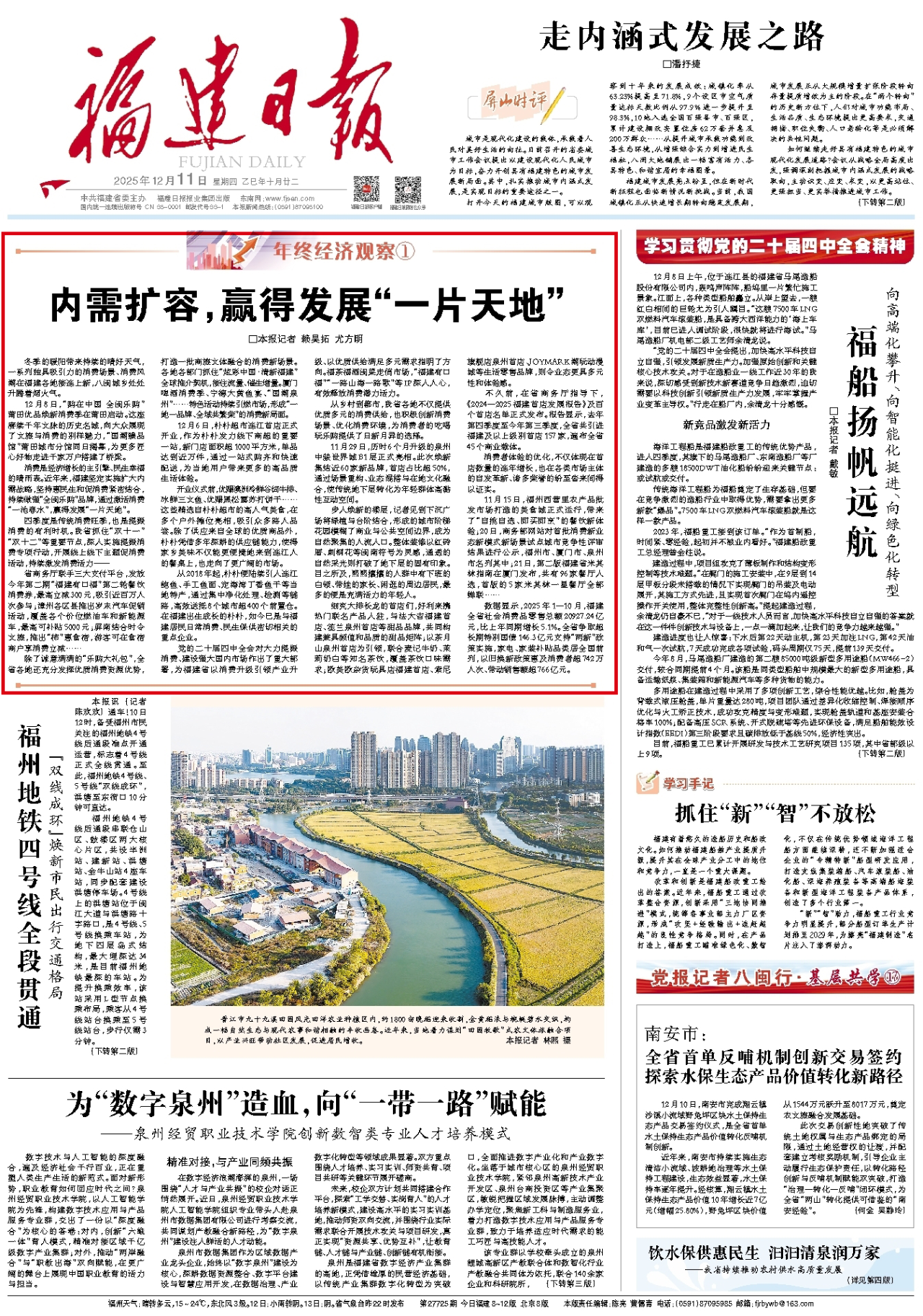 党的二十届四中全会对大力提振消费、建设强大国内市场作出了重大部署,为福建省以消费升级引领产业升级、以优质供给满足多元需求指明了方向。福茶福酒闽菜走俏市场,“福建有口福”“一路山海一路歌”等IP深入人心,有效释放消费潜力活力。