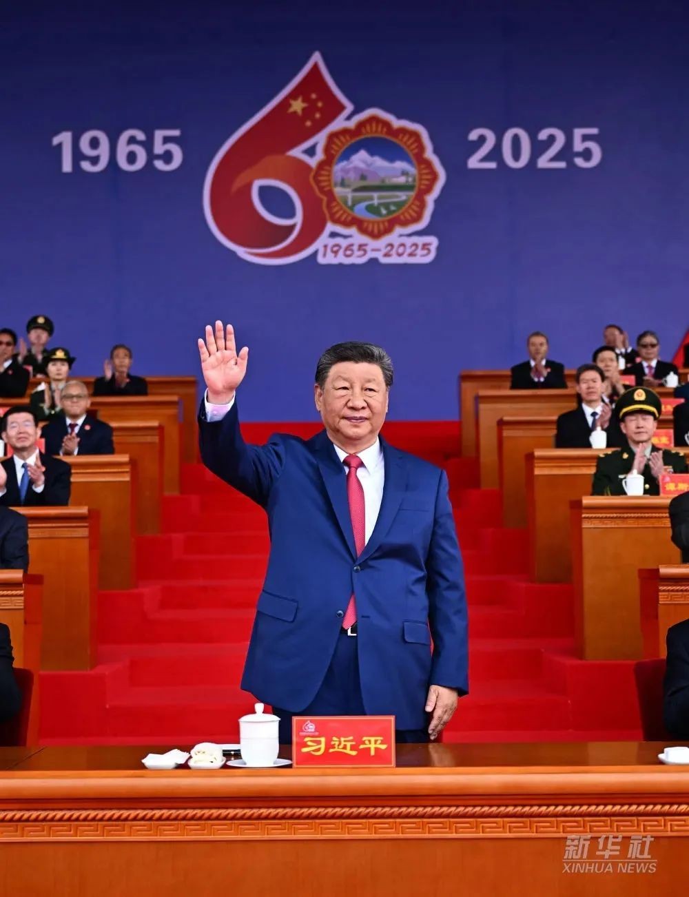 古城拉萨彩旗飘扬,处处洋溢着节日的氛围。雄伟的布达拉宫下,搭建起藏式风格的大会主席台。主席台上方中华人民共和国国徽和“西藏自治区成立60周年庆祝大会”横幅十分醒目,背景墙上悬挂着大庆会徽和“1965”“2025”字样,10面红旗分列两侧。主席台对面的布达拉宫广场上,身着节日盛装的各族群众从四面八方汇聚到这里,手中挥动着红旗,汇聚成一片欢乐的海洋。
