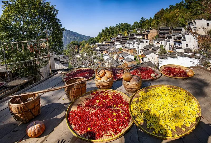 “一叶梧桐一报秋,稻花田里话丰收”,在我国南方一些地区,晒秋已经成了农家喜庆丰收的“盛典”,“晒秋”的秋不仅仅是秋天,更代表一种丰收的喜悦,老百姓会利用房前屋后的平台、房顶等空地,晒一晒收获的农作物,粮食晒得越多,说明收成越好,而把粮食风干后,冬天才不会发霉变质,是老一辈多年的经验心得,也是一种特殊的文化符号。