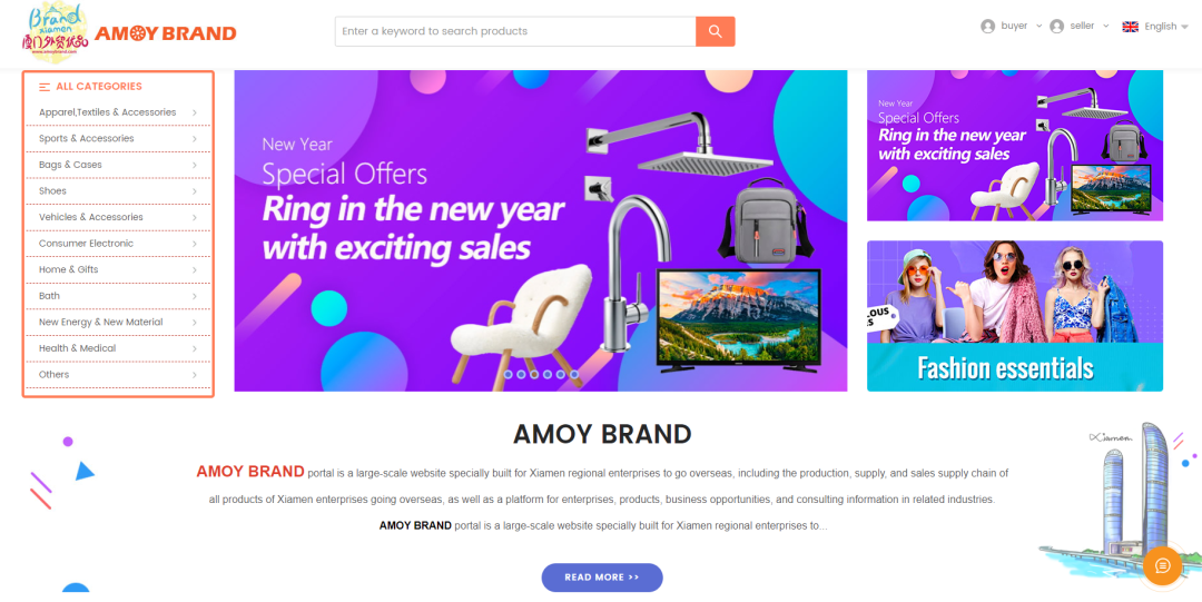 打造AMOYBRAND厦门品牌出海门户网站。在门户网站(www.amoybrand.com)设置了服装、卫浴、运动、箱包、消费电子、工艺品、鞋、汽配八大重点推广品类,截至2023年3月底已有135家品牌企业入驻,上线近6500种商品。