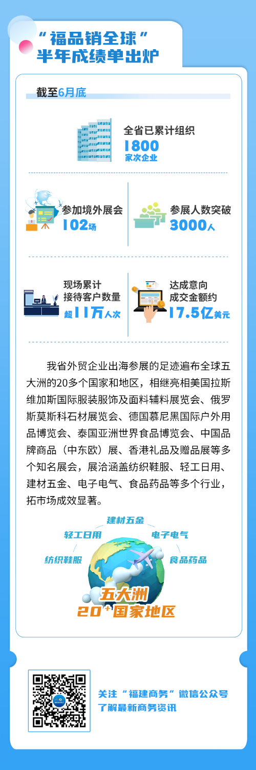 2023年一开始,省商务厅就启动“福品销全球”系列活动,将帮助企业稳需求、稳订单、拓市场作为重中之重,支持企业通过境外参展、线上参展、代参展以及参加福品博览会等内外贸一体化展会稳订单、拓市场。据第三方机构统计,第二季度我省组织企业参展规模居全国第5位。