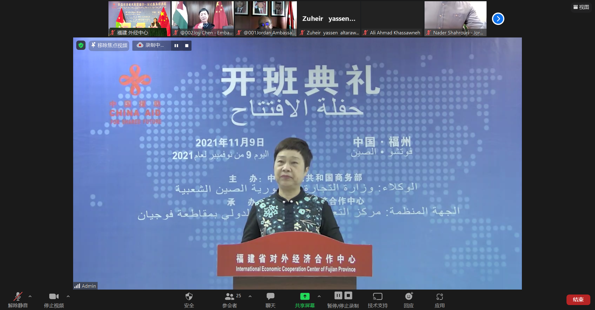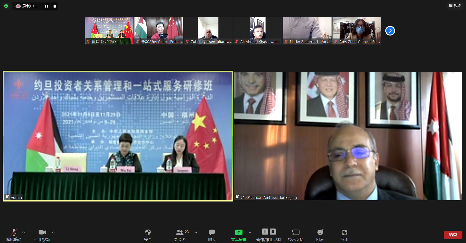 11月9日,由商务部主办、福建省对外经济合作中心承办的国家援外人力资源开发合作项目 “约旦投资者关系管理和一站式服务研修班” 线上开班典礼在榕顺利举行。省商务厅二级巡视员吴霏、约旦驻华大使胡萨姆·侯赛尼阁下、中国驻约旦使馆经商处代参赞陈少君应邀出席并致辞。