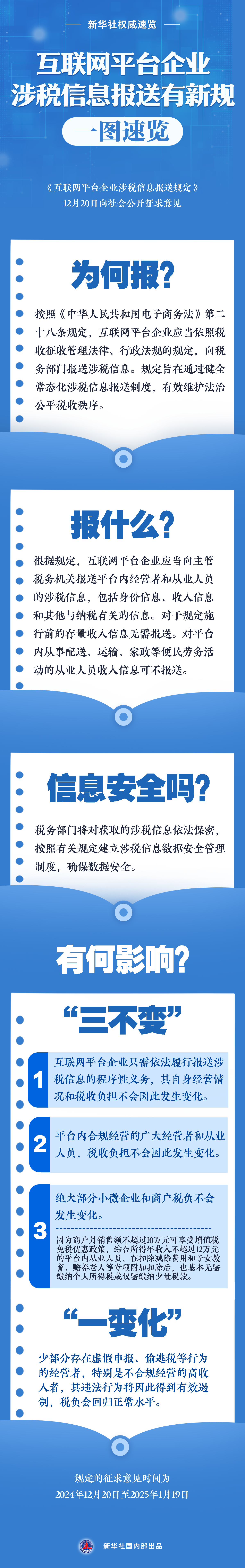 为促进平台经济健康有序发展,国家税务总局会同国家市场监督管理总局研究起草了《互联网平台企业涉税信息报送规定(征求意见稿)》,12月20日向社会公开征求意见。