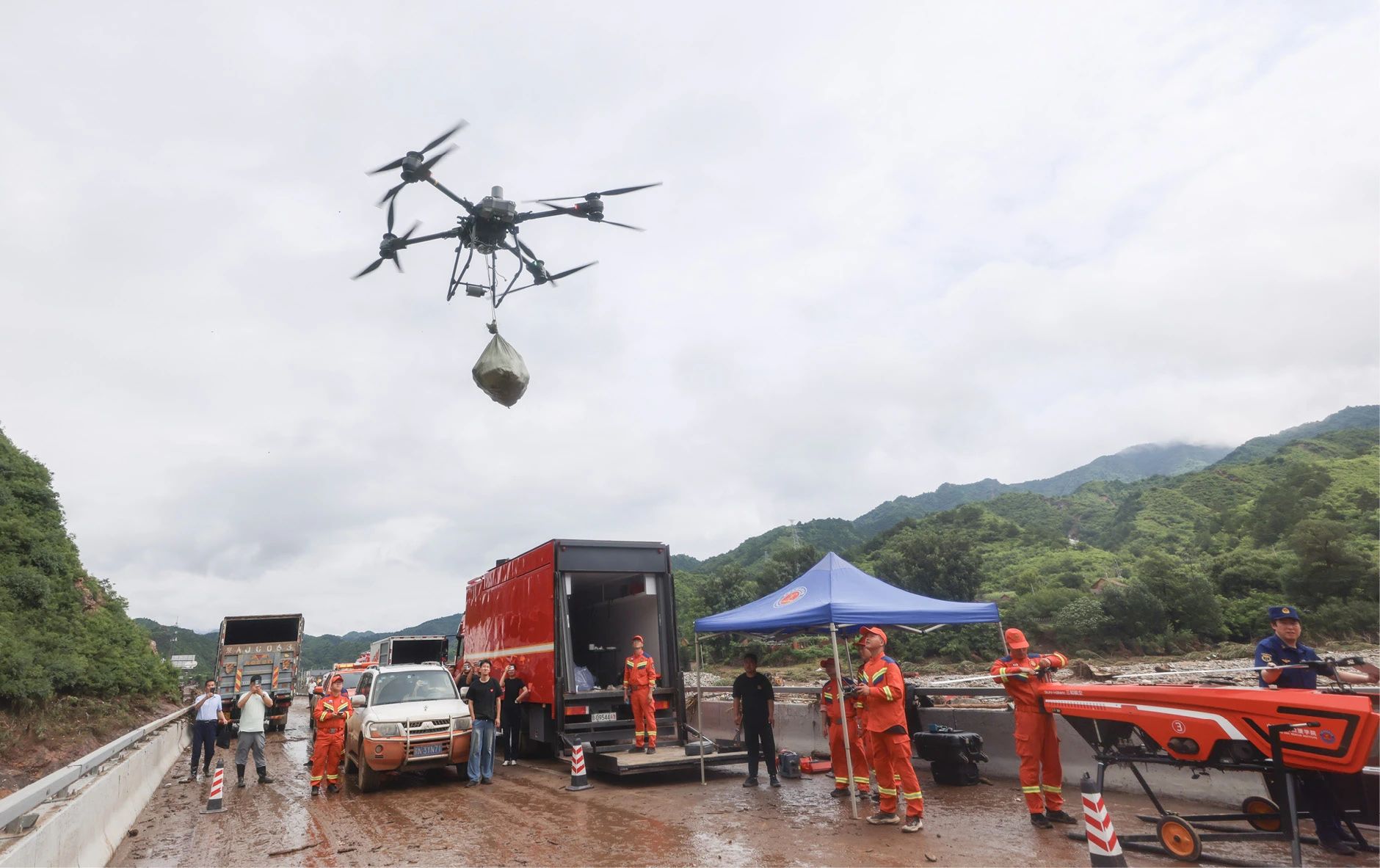 2025年7月28日,北京市怀柔区琉璃庙镇,应急救援人员使用无人机运送抢险物资。