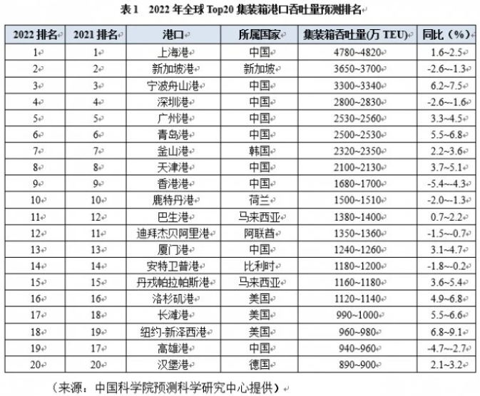 7月12日,中国科学院预测科学研究中心发布《2022年全球Top20集装箱港口预测报告》。报告显示,在全球前20大集装箱港口中,中国占了9个,且其中7个跻身前10。与2021年相比,今年前10名港口排名顺序未发生变动,分别为上海港、新加坡港、宁波舟山港、深圳港、广州港、青岛港、釜山港、天津港、香港港、鹿特丹港。2022年全球Top20港口集装箱吞吐量预测排名(见表1)。