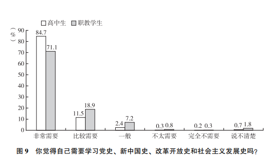红色基因和红色精神已融入青少年成长历程。党的历史是最生动、最有说服力的教科书。要抓好青少年教育,就要着力讲好党的故事,厚植爱党爱国情感,让红色基因、革命薪火代代传承。调查显示,不同阶段的青少年群体积极从党史学习中激发信仰、汲取力量,借助创新多样的党史学习形式、丰富生动的党史学习内容,形成了“学党史、强信念、跟党走”的生动局面,使得党史学习教育真正在青少年群体中走心走深走实。如认为“学习党史、新中国史、改革开放史和社会主义发展史是极为必要的”的高中生和职教学生比例分别为96.2%和90%(见图9),而对于小学生和初中生而言,98.2%的教师和92.9%的家长认为学生有必要学习一些党史知识。在最受欢迎的党史学习途径方面,思政课成为不同阶段群体的共同选择,高中生、职教学生、大学生、青年职工的选择比例分别为82.8%、88.3%、90.4%和83.3%。在党史学习内容方面,92%的青少年认为红色影视剧最具吸引力。通过党史学习教育,89.6%的教师认为最重要的收获就是“增加了学生对党的认识和了解程度,坚定了听党话、跟党走的决心”。