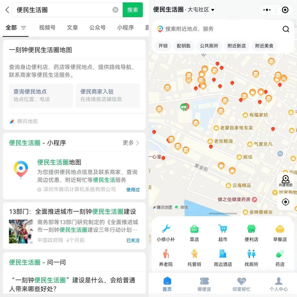 用户通过微信小程序或者腾讯地图App搜索“便民生活圈”即可进入,并且支持用户搜索“小修小补”“菜店”“大型超市”“便利店”“早餐店”等不同的便民门类,进入相应主题地图;地图还涵盖了“哪便宜”“邻里帮忙”两大功能,前者可提供周边商超美食、娱乐休闲优惠信息,后者基于腾讯地图位置服务能力,为有临时、紧急需求的市民提供线上互助社区。便民地图同时新增多项商户权益,比如商家入驻地图后可开通微信客服,方便附近居民直接联系店主。