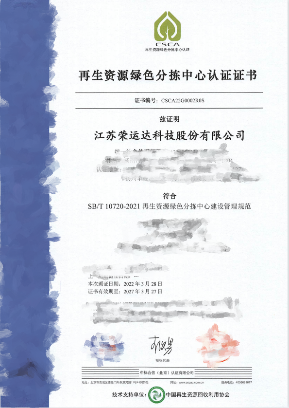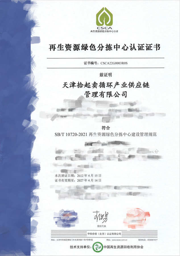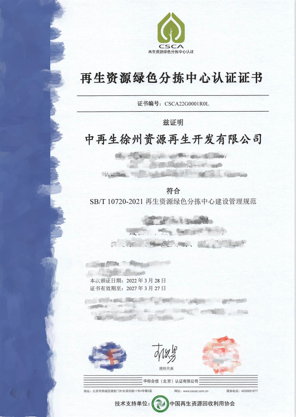 以上分别为再生资源绿色分拣中心刚刚认证编号分别为CSCA22G0001R0L、CSCA22G0002R0S和CSCA22G0003R0S的中再生徐州资源再生开发有限公司、江苏荣运达科技股份有限公司和天津拾起卖循环产业供应链管理有限公司。