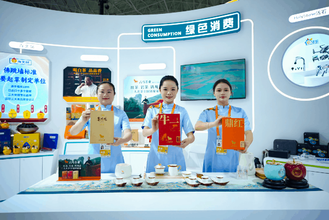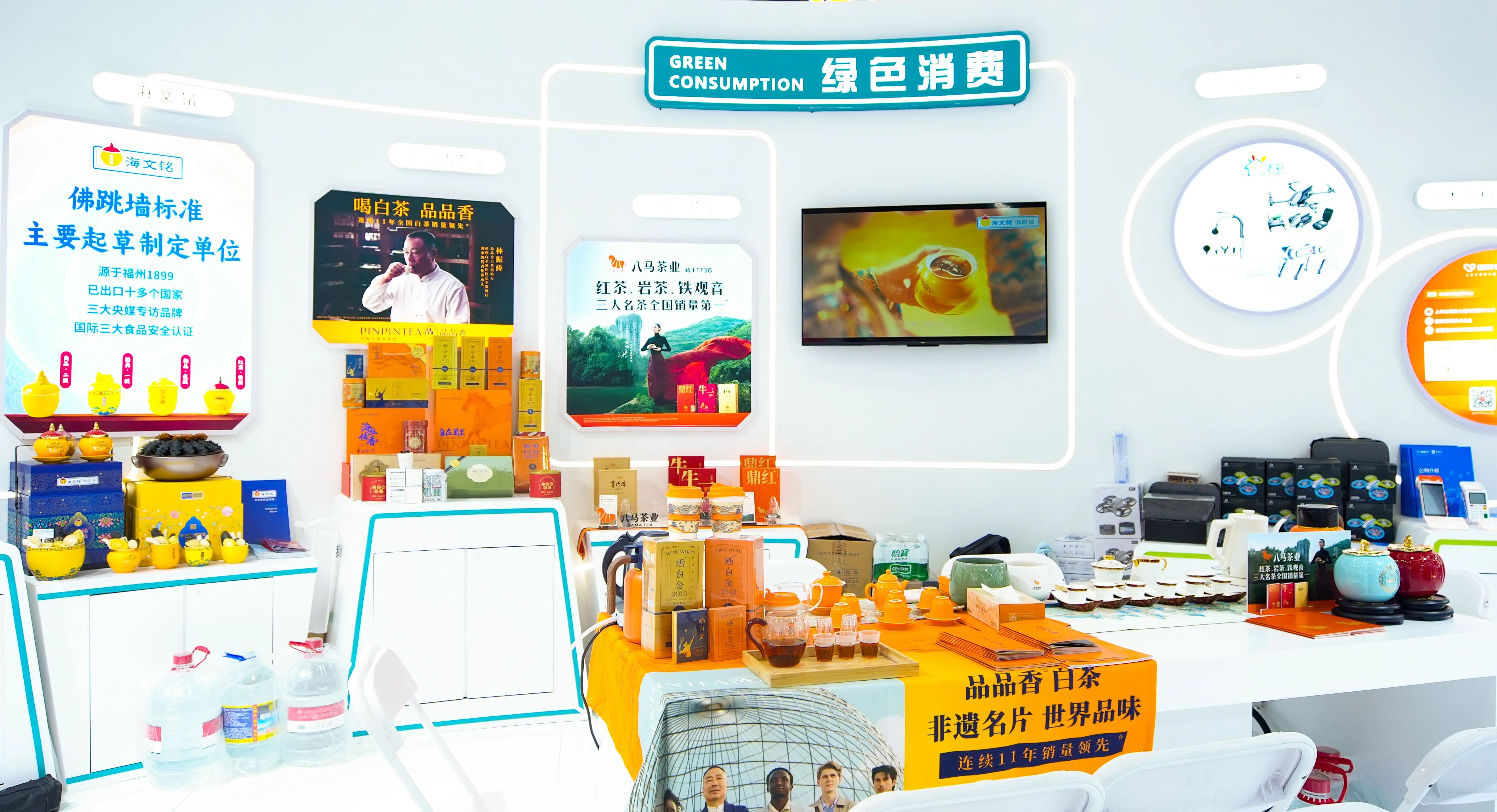 步入绿色消费展区,即被缕缕浓郁的茶香所吸引。八马、品品香等知名茶企的特色品鉴引得慕名前来的茶友络绎不绝。反复品啜,岩茶浓郁深重如醇厚之酒,白茶清雅素净似山间幽泉,乌龙馥郁回甘若春日暖阳。迥异的风味源于八闽山脉间丰富的山场地貌,却共同深蕴着土地的无限滋养、茶农的坚守和时间的沉淀。