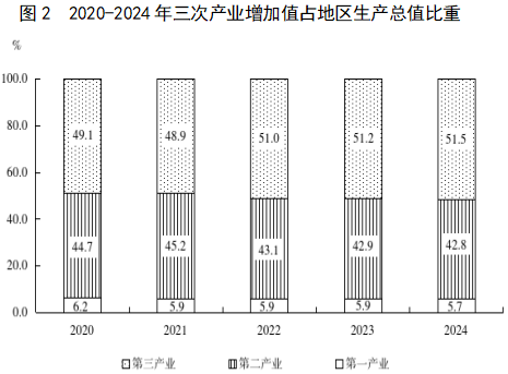 初步核算,全年实现地区生产总值57761.02亿元,比上年增长5.5%。其中,第一产业增加值3287.67亿元,增长3.4%;第二产业增加值24713.16亿元,增长5.8%;第三产业增加值29760.19亿元,增长5.5%。第一产业增加值占地区生产总值的比重为5.7%,第二产业增加值比重为42.8%,第三产业增加值比重为51.5%。全年人均地区生产总值137920元,比上年增长5.5%。