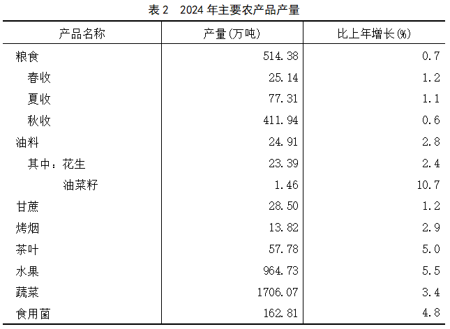 全年农林牧渔业总产值5854.87亿元,比上年增长3.4%。粮食种植面积844.41千公顷,比上年增加3.31千公顷。粮食产量514.38万吨,比上年增加3.42万吨,增长0.7%。其中,稻谷产量397.68万吨,增加3.04万吨,增长0.8%。