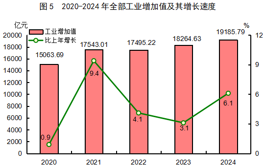 全年全部工业增加值19185.79亿元,比上年增长6.1%。规模以上工业增加值增长6.7%。其中,轻工业增长4.4%,重工业增长8.6%;采矿业增长1.9%,制造业增长6.7%,电力、热力、燃气及水生产和供应业增长6.8%。工业产品销售率96.48%。