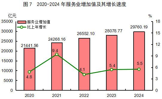 全年批发和零售业增加值7768.53亿元,比上年增长7.0%;交通运输、仓储和邮政业增加值1885.66亿元,增长9.4%;住宿和餐饮业增加值987.91亿元,增长7.9%;金融业增加值3258.74亿元,增长1.8%;房地产业增加值2738.19亿元,下降5.0%。规模以上服务业企业营业收入比上年增长9.5%。