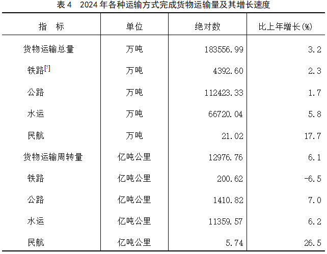 全年货物运输总量183556.99万吨,比上年增长3.2%;货物运输周转量12976.76亿吨公里,增长6.1%。旅客运输总量49733.43万人,增长12.6%;旅客运输周转量1194.39亿人公里,增长15.7%。