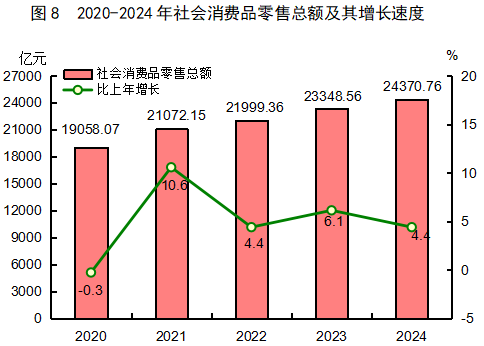 全年社会消费品零售总额24370.76亿元,比上年增长4.4%。按经营地统计,城镇消费品零售额20579.67亿元,增长4.4%;乡村消费品零售额3791.09亿元,增长4.5%。按消费类型统计,商品零售额21816.54亿元,增长4.1%;餐饮收入额2554.22亿元,增长6.6%。