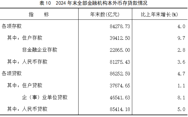 年末金融机构本外币各项存款余额84278.73亿元,比上年末增长4.0%;金融机构本外币各项贷款余额86252.59亿元,比上年末增长4.7%。