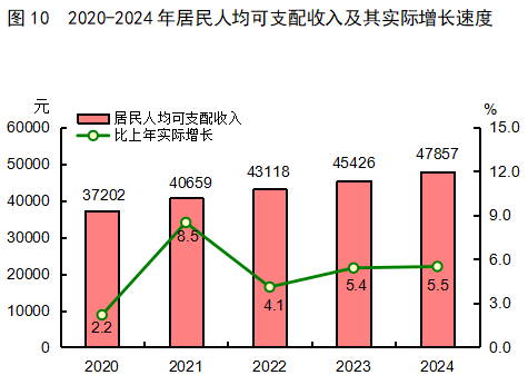 全年居民人均可支配收入47857元,比上年增长5.4%,扣除价格因素,实际增长5.5%。按常住地分,农村居民人均可支配收入28525元,增长6.7%,扣除价格因素,实际增长6.9%;城镇居民人均可支配收入58763元,增长4.6%,扣除价格因素,实际增长4.8%。城乡居民人均可支配收入比值为2.06,比上年缩小0.04。