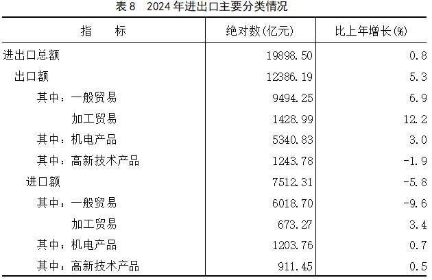 全年货物进出口总额19898.50亿元,比上年增长0.8%。其中,出口额12386.19亿元,增长5.3%;进口额7512.31亿元