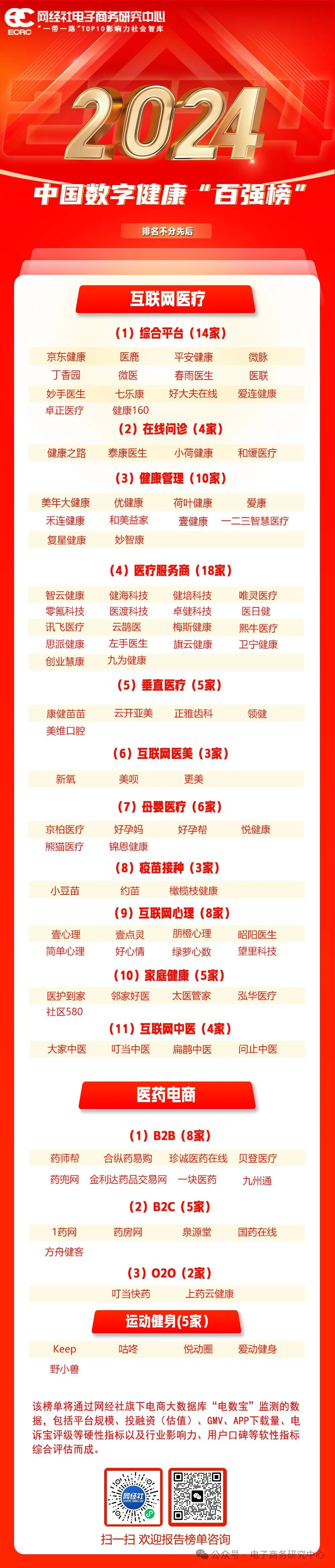 《报告》披露了《2024年中国数字健康“百强榜”》,该榜单经过 “电数宝”收录的企业数据,包括平台规模、营收、利润、投融资(估值)、月活、评级等硬性指标以及行业影响力、口碑等软性指标综合评估而成。