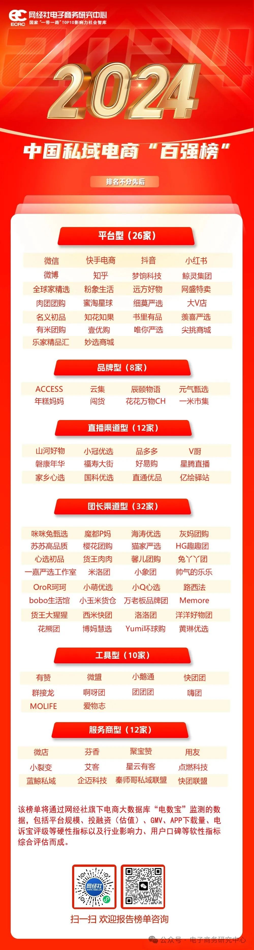 私域电商领域良莠不齐,为褒奖过去一年私域电商领域的佼佼者,《报告》公布了《2024年中国私域电商“百强榜”》,包括: