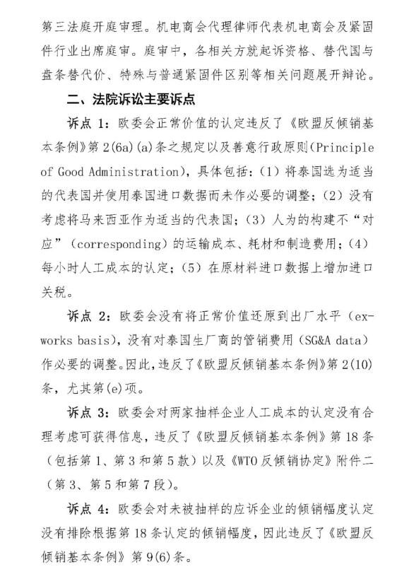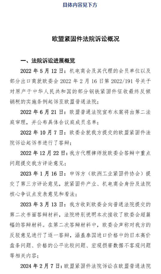 2022年5月12日,中国机电商会及其代理的会员单位以及部分出口商就欧委会2022年2月16日第2022/191号关于对原产于中华人民共和国的部分钢铁紧固件征收最终反倾销税的实施条例起诉至欧盟普通法院。书面抗辩阶段,中国机电商会代表行业就欧委会答辩中的重点问题提交我方评论意见。2024年2月7日,欧盟紧固件法院诉讼在欧盟普通法院第三法庭开庭审理,中国机电商会代理律师代表中国机电商会及紧固件行业出席庭审。庭审中,各相关方就起诉资格、替代国与盘条替代价、特殊与普通紧固件区别等相关问题展开辩论。