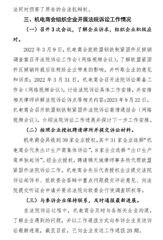 针对欧委会在紧固件反倾销调查中违反世贸规则和欧盟反倾销条例的错误做法和裁定,在中国机械通用零部件工业协会紧固件分会配合下,中国机电商会组织企业召开法院诉讼工作会,讨论通过司法救济途径维护中方紧固件企业利益,最终共有39家企业授权中国机电商会代表行业开展欧盟紧固件法院诉讼工作,其中8家企业选择采取单独起诉方式,31家企业选择采取由中国机电商会代表企业进行集体诉讼方式。