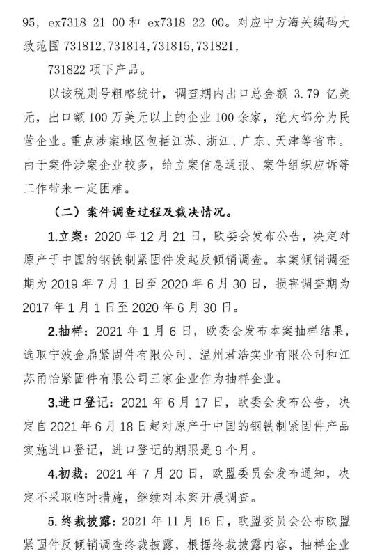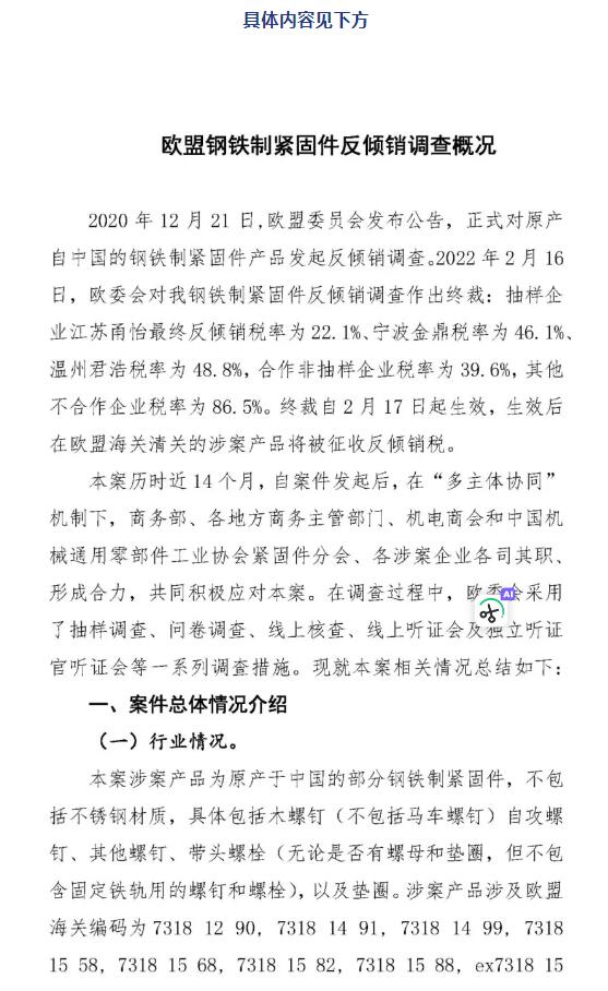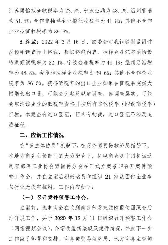2020年12月21日,欧盟委员会发布公告,正式对原产自中国的钢铁制紧固件产品发起反倾销调查。2022年2月16日,欧委会对我钢铁制紧固件反倾销调查作出终裁:抽样企业江苏甬怡最终反倾销税率为22.1%、宁波金鼎税率为46.1%、温州君浩税率为48.8%,合作非抽样企业税率为39.6%,其他不合作企业税率为86.5%。