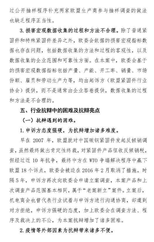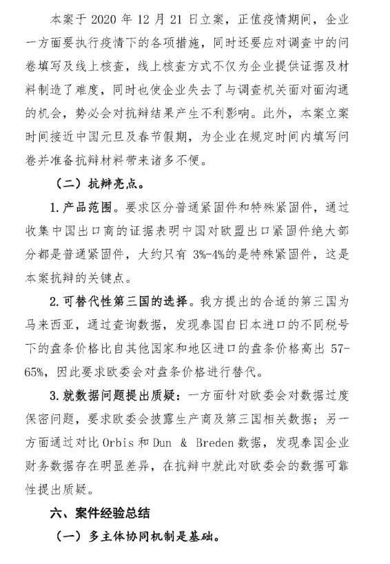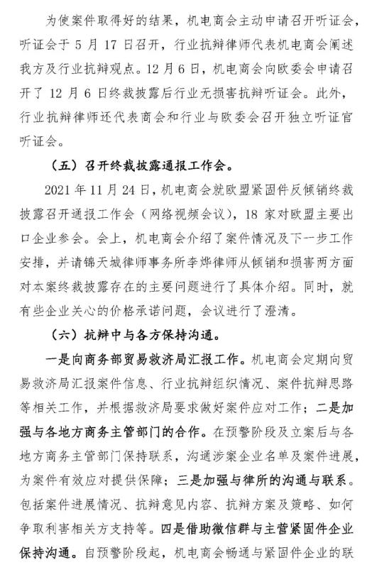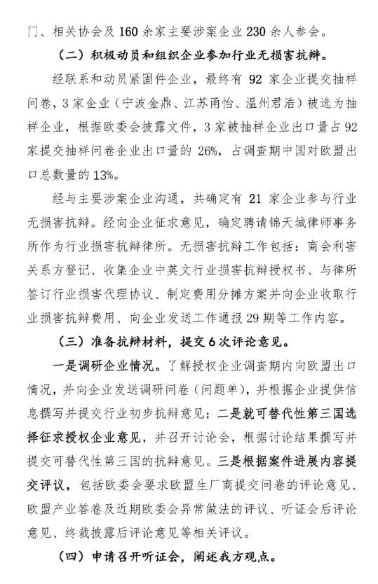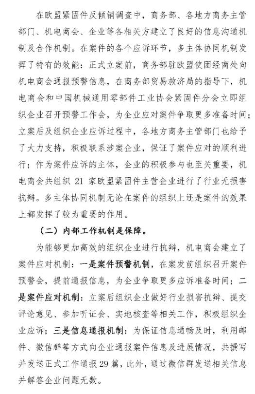 在“多主体协同”机制下,中国机电商会及中国机械通用零部件工业协会紧固件分会在正式立案前即召开案件预警工作会,并在立案后积极动员和组织企业积极应对,最终有92家企业提交抽样问卷、21家企业参与行业无损害抗辩;代表行业先后就可替代性第三国选择、欧盟产业答卷、终裁披露等内容提交6次评论意见;申请召开听证会,向欧委会阐述我方观点;争取进口商等利害相关方支持,向欧委会施压。