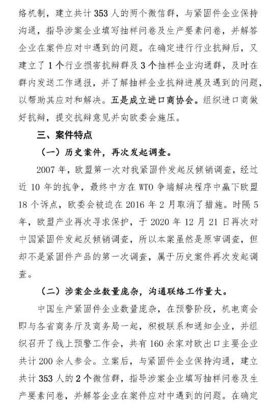 本案有两大特点:一是本案属“老案新立”案件,欧委会于2007年第一次对紧固件发起反倾销调查,经过近10年的抗争,最终中方在WTO争端解决程序中赢下欧盟18个诉点,欧委会被迫在2016年2月取消了措施。时隔5年,欧盟产业再次寻求保护,促使欧委会再次发起调查;二是涉案企业数量庞杂,沟通联络工作量大。预警工作会共有160余家对欧出口主要企业共计200余人参会,为与企业进行及时有效沟通,建立2个案件沟通群和1个行业损害抗辩群,共计400余人,指导涉案企业填写问卷,积极组织行业抗辩,并解答企业在案件应对中遇到的问题。针对不同企业的不同意见,沟通协调工作面临较大困难。