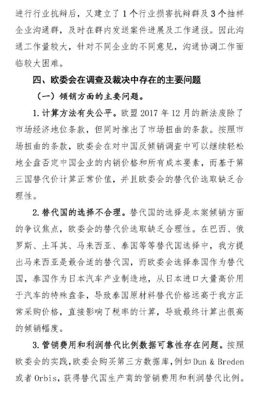 欧委会在本案调查及裁决中存在诸多问题:从倾销方面来讲,欧委会基于第三国替代价计算正常价值的计算方法有失公平,将泰国作为替代国的选择也不合理,管销费用和利润替代比例数据可靠性也存在问题;从损害方面来讲,调查产品范围不匹配,抽样上也存在程序性错误,损害宏观数据收集的过程和方法也不合理。上述倾销和损害方面存在的问题,最终导致对企业征收了较高税率。