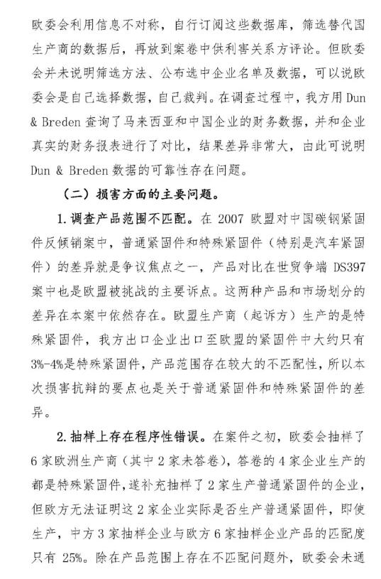 尽管案件应对在客观上存在诸多困难和问题,但我方依然从主观上积极应对,寻找抗辩突破点:一是从产品范围入手,通过收集中国出口商材料证明中国对欧盟出口紧固件绝大部分都是普通紧固件而不是特殊紧固件(占比只有3%-4%);二是针对欧委会选择泰国作为可替代性第三国,通过数据证明泰国自日本进口的不同税号下的盘条价格比自其他国家和地区进口的盘条价格高出57-65%,以此要求欧委会对盘条价格进行替代;三是就数据问题提出质疑,要求欧委会披露生产商及第三国相关数据,并对欧委会使用数据的可靠性提出质疑。