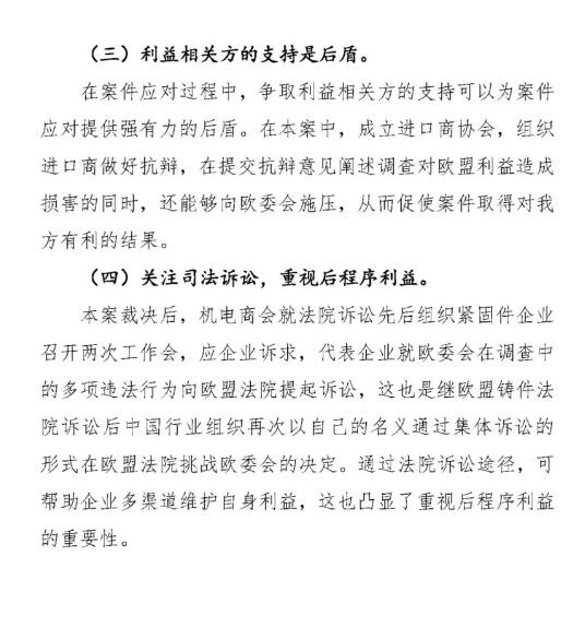 在本案应对过程中,多主体协同机制是基础,商务部、各地方商务主管部门、中国机电商会、中国机械通用零部件工业协会紧固件分会及企业等各相关方建立了良好的信息沟通机制及合作机制。此外,争取利益相关方的支持也为案件应对提供强有力的后盾,成立进口商协会,提交抗辩意见并向欧委会施压,促使案件取得对我方有利结果。本案裁决后,中国机电商会就法院诉讼组织召开工作会,代表企业就欧委会在调查中的多项违法行为向欧盟法院提起诉讼。企业通过法院诉讼途径维护自身利益,也凸显出重视后程序利益的重要性。