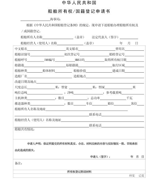 4.原船舶登记机关出具的注销船舶国籍登记证明书或者将于重新登记时立即注销原国籍的证明书(适用于原已登记过的船舶,可以和所有权登记注销证明书合并);