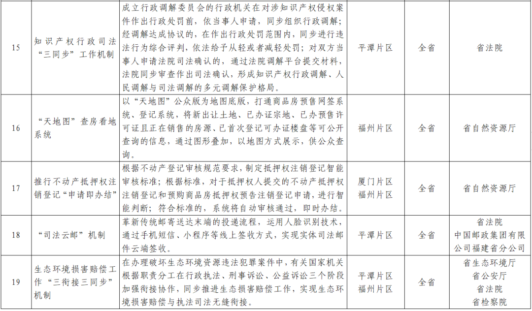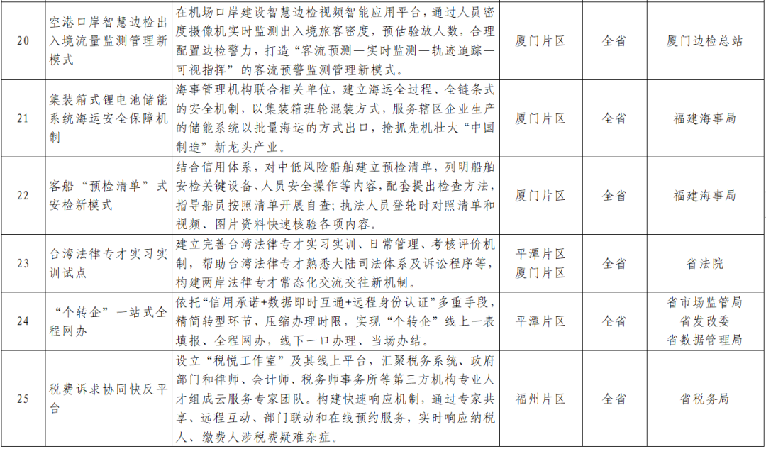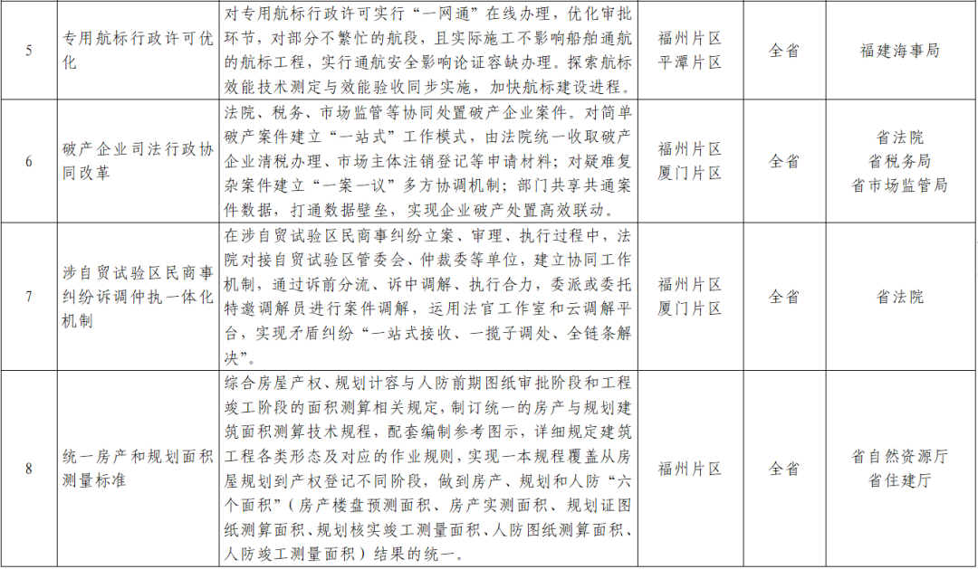 福建自贸试验区第十批制度创新成果复制推广任务分工表