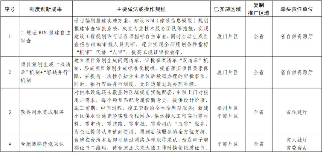 福建自贸试验区第十批制度创新成果复制推广任务分工表