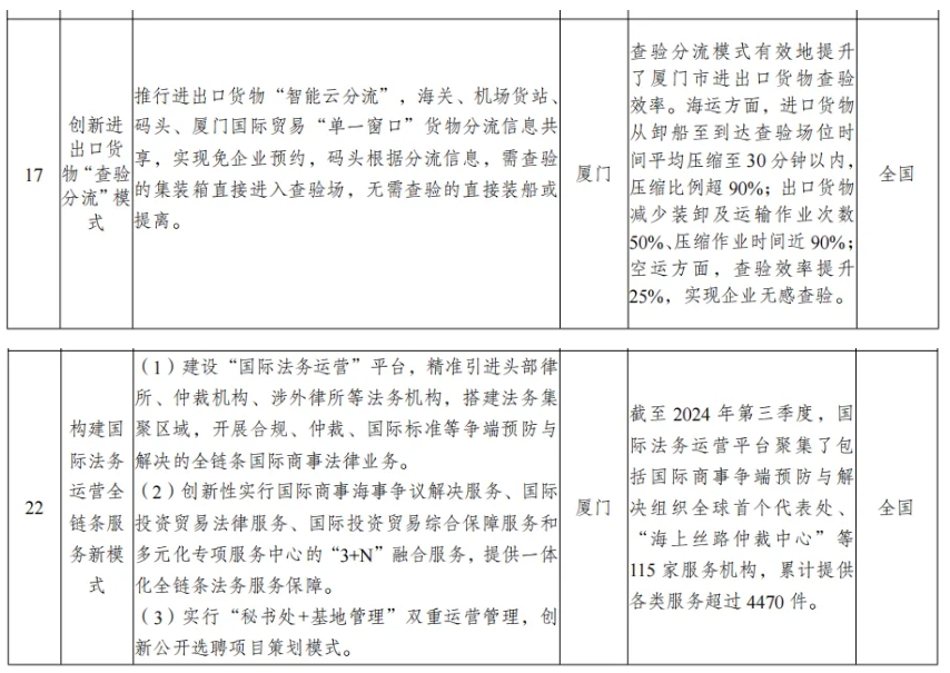 此次厦门在全国推广的13项综合改革试点经验中,厦门自贸片区联合相关部门推出的创新进出口货物“查验分流”模式、构建国际法务运营全链条服务新模式等2项创新举措入选