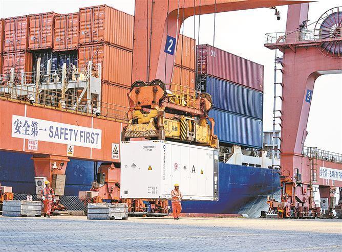 7月29日傍晚,记者在海润码头看到,尽管作业量创历史新高,但现场井然有序——18时许,数十辆载有储能集装箱的运输车在指挥员引导下进场,巨型桥吊精准对接,随着“咔嗒”一声锁扣到位,储能集装箱被缓缓吊起,装载工作正式展开。