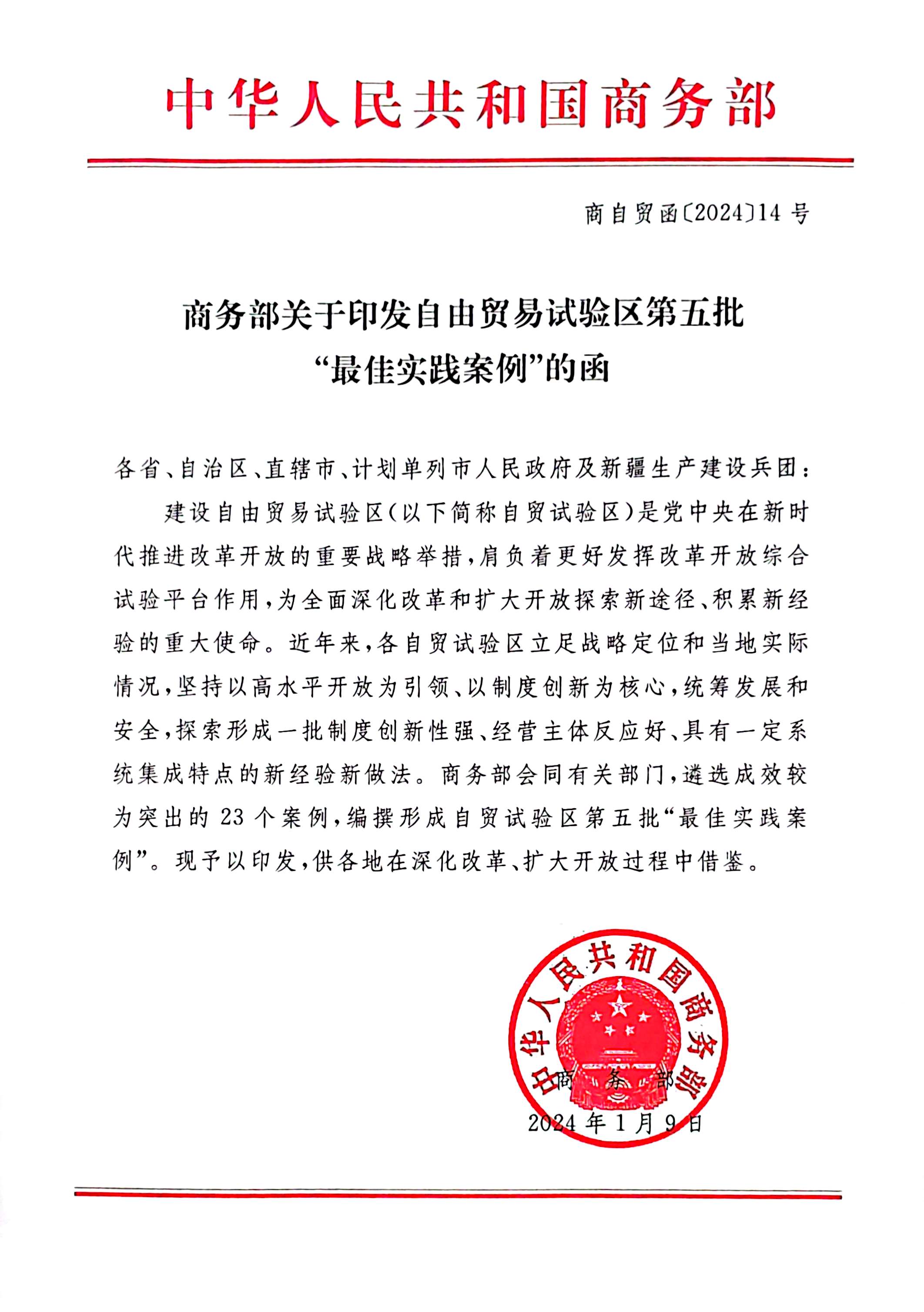商务部关于印发自由贸易试验区第五批“最佳实践案例”的函